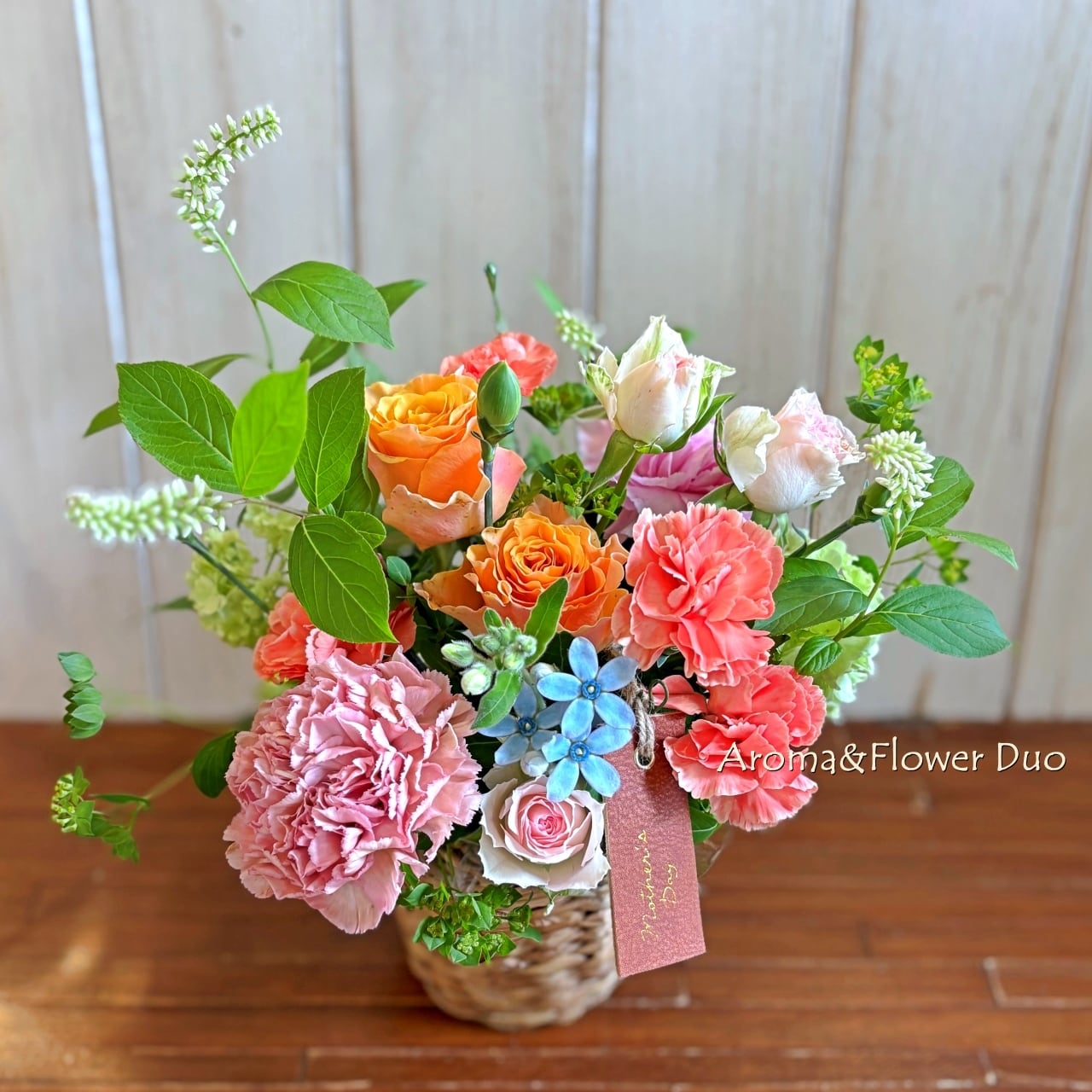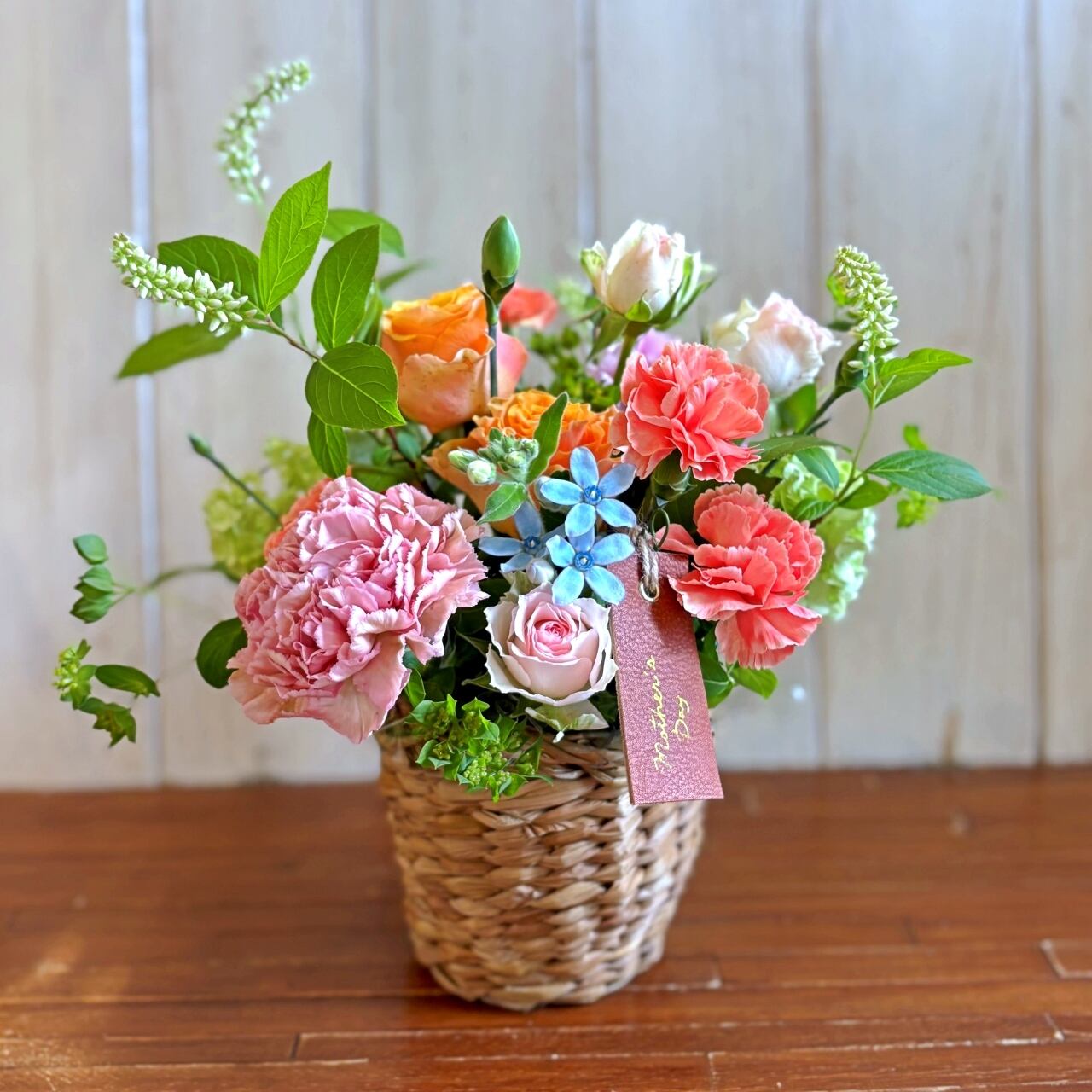 カーネーションやバラを使ったナチュラルなバスケットアレンジは