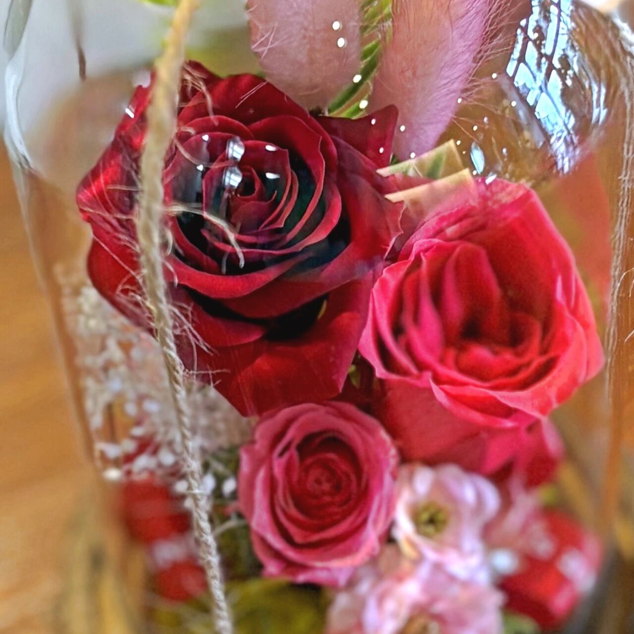 高級感あふれるガラスのドームに薔薇のプリザをアレンジ。おしゃれなお部屋のインテリアとしてオススメの商品です。お誕生日などの記念日のプレゼントやお祝いに。枯れない美しさをどうぞ。現品限り(色違いのある場合がありますので、お問い合せください)