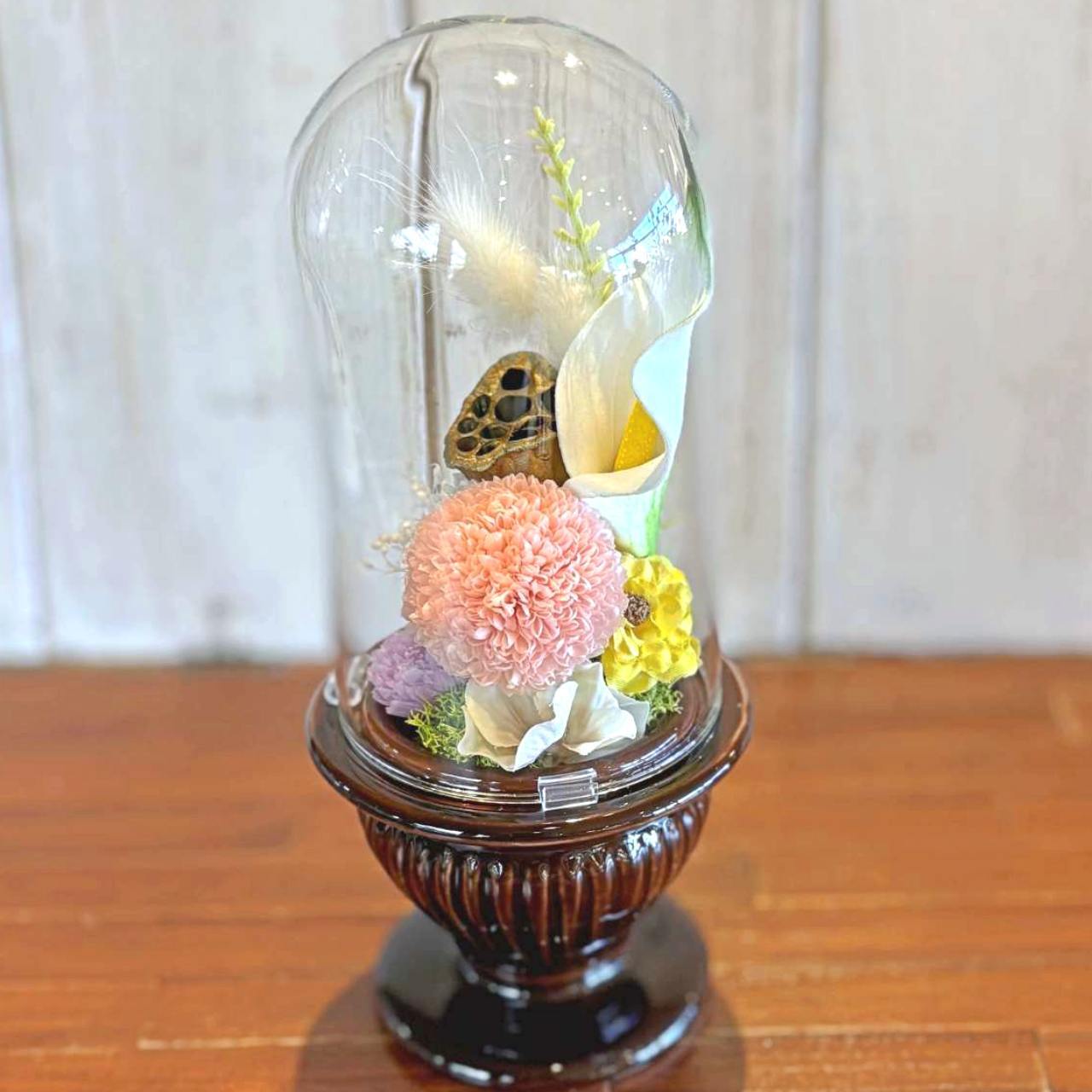 ガラスのドームの中に薔薇やマム(菊)のプリザをアレンジ。お水を替えたりする手間がないので暑い夏でも大丈夫です。